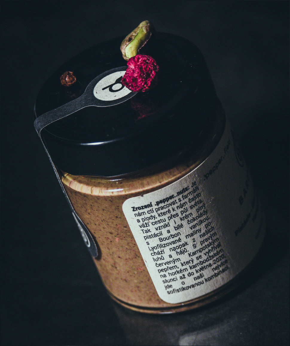 The answer is this butter, which combines the taste of pistachios, Kampot pepper and raspberries from Czech groves. They provide the earthy taste of pistachios that perfect freshness, which is highlighted by the fiery taste of red pepper with its fruity notes.