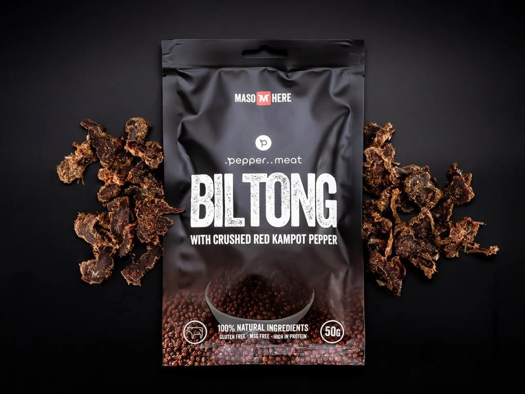 Contrairement au jerky, les épices utilisées pour assaisonner la viande sont également différentes, ce qui lui confère un goût absolument spécifique. Nous avons décidé d'ajouter à cette méthode spéciale de préparation, qui trouve ses racines en Afrique du Sud, le meilleur de l'Asie du Sud sous la forme du poivre rouge de Kampot, et le résultat est un goût absolument mondial.