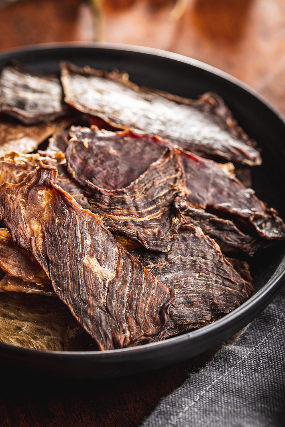 Le biltong est une viande séchée spécialement préparée, qui, contrairement au jerky, est tranchée en fines lamelles après le processus de séchage. Grâce à cela, ce type de viande est incroyablement juteux, savoureux et authentique. Grâce aux tranches plus épaisses, il ressemble beaucoup plus à de la viande fraîche. Il est principalement fabriqué à partir de viande de bœuf, mais on trouve aussi du biltong de lama, d'antilope, d'autruche ou de gibier.
