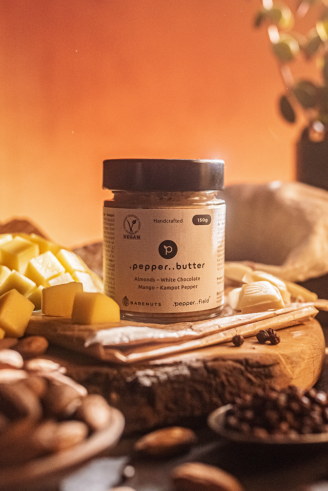 Kešu máslo s makadamovým oříškem, bílou čokoládou, dračím ovocem a Kampotským pepřem (150 g)